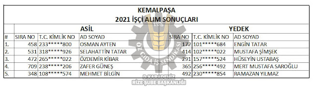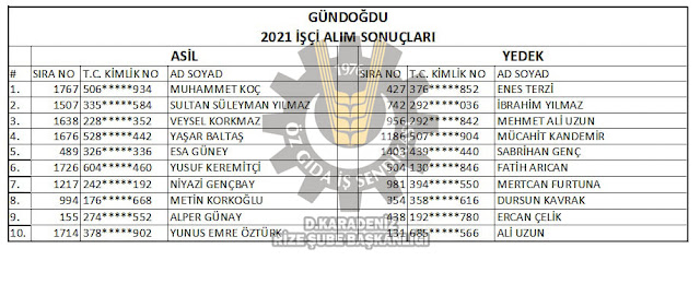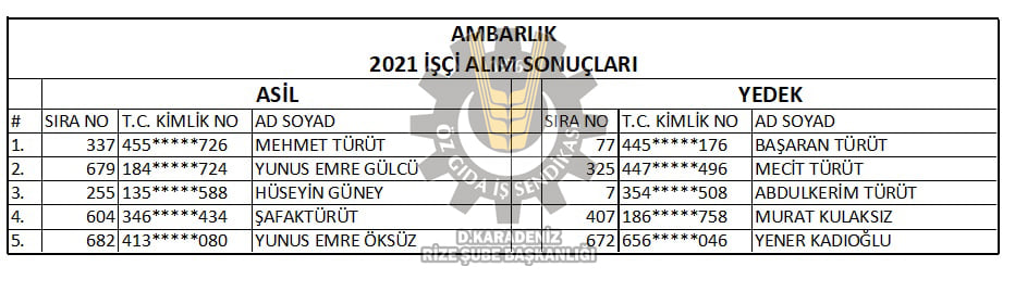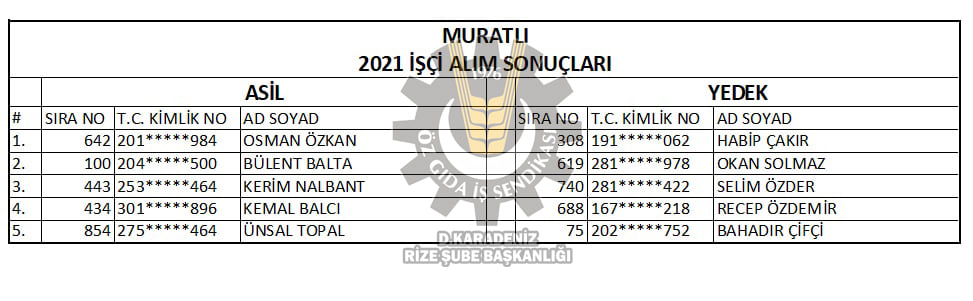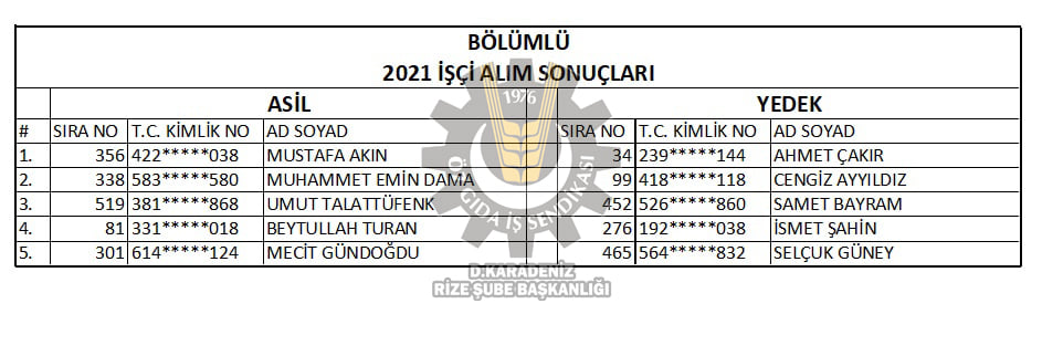 ASIL: 125 Fehmi Uğur Ay - 17 Ahmet Uzun - 182 İlker Erdoğan - 246 Muhammet Öztürk - 309 Özkan Sabri Yılmaz