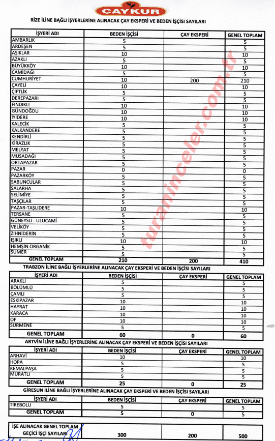Çay İşletmeleri Çay Eksperliği veya Çay Tarımı ve İşletme Teknolojisi bölümü mezunu 200 geçici çay eksperi ve noter kurası ile 300 geçici beden işçisi (tahmil tahliye) alınacaktır.